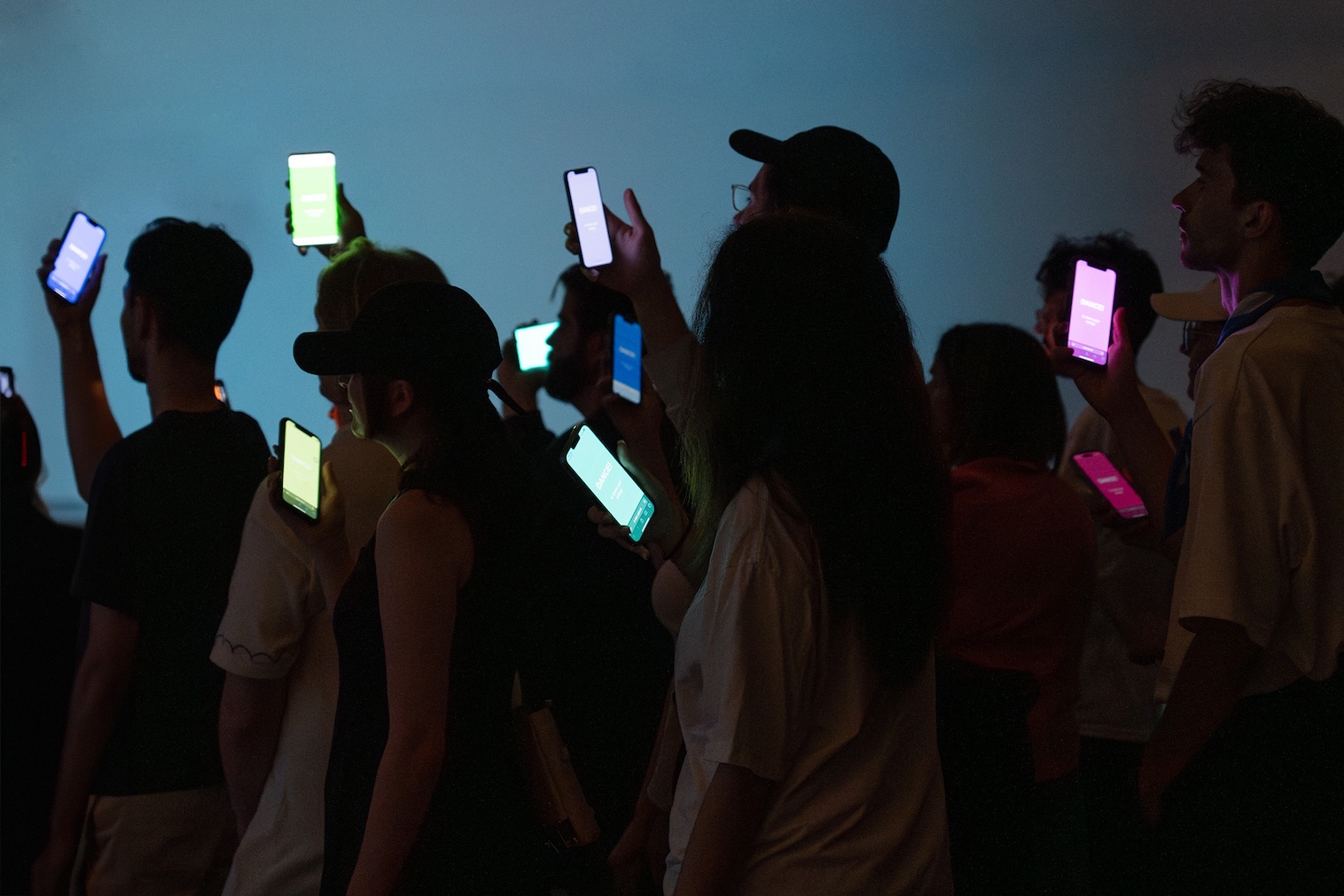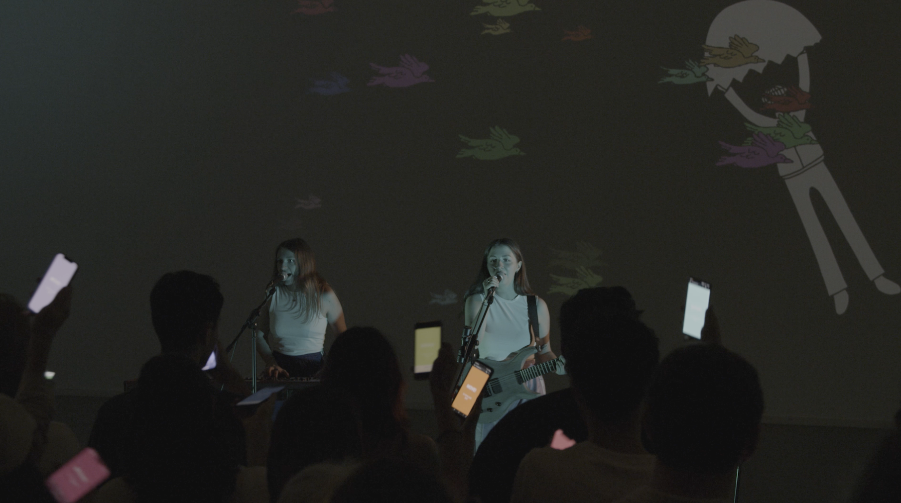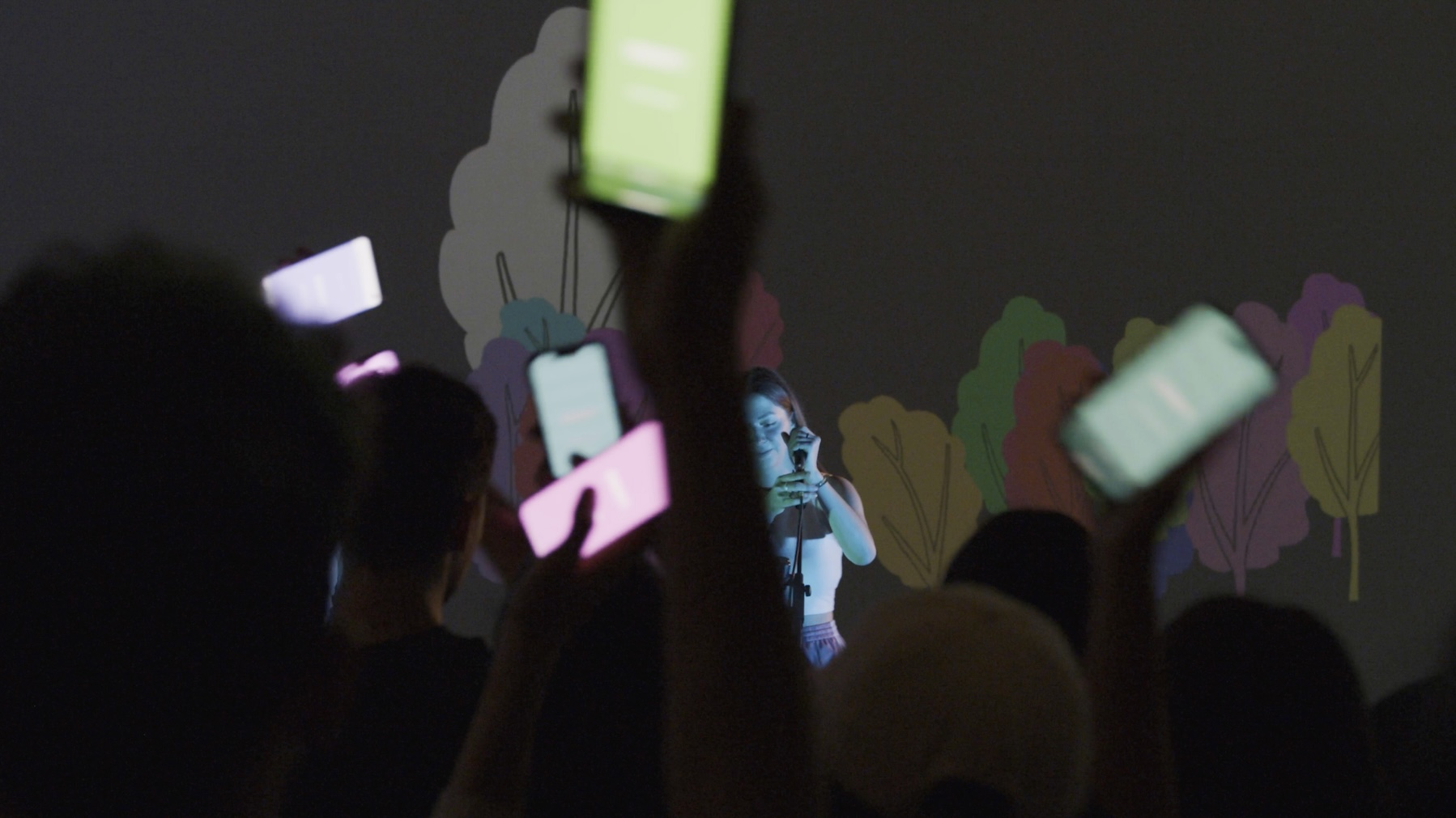 Avez-vous déjà souhaité faire partie du spectacle lors d’un concert auquel vous assistiez ? C’est tout l’enjeu du projet Take Part. Une scénographie interactive conçue autour d’une chanson spécialement composée par mon duo musical avec ma sœur. Le téléphone, souvent perçu comme un intermédiaire perturbant entre les artistes et le public, devient ici un outil de connexion qui renforce les liens et amplifie l’énergie collective. En effet, chaque spectateur participe à la projection derrière les musiciens en utilisant son téléphone. Le public suit un personnage au style dessiné à la main, animé en 2D, qui voyage à travers différents mondes pour retrouver des forces, avant de transmettre à son tour une énergie positive et joyeuse. J’ai développé ce dispositif dans le cadre de mon diplôme de Bachelor à l’ECAL.